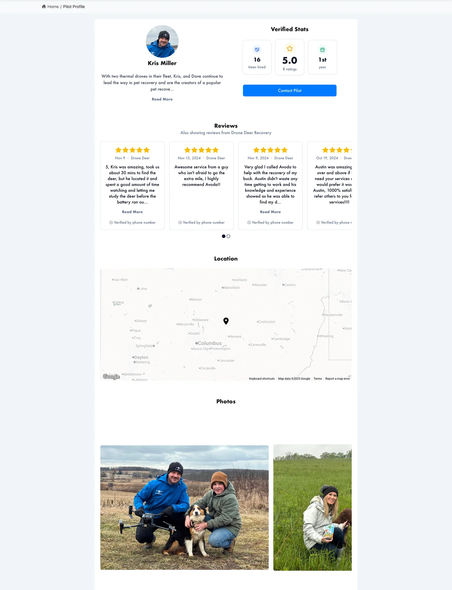 Add photos and information to your pilot profile. Include any helpful information to help folks choose you to find their pet. Do you have any special skill or service offerings? Do you have additional services such as traps to rent or borrow?