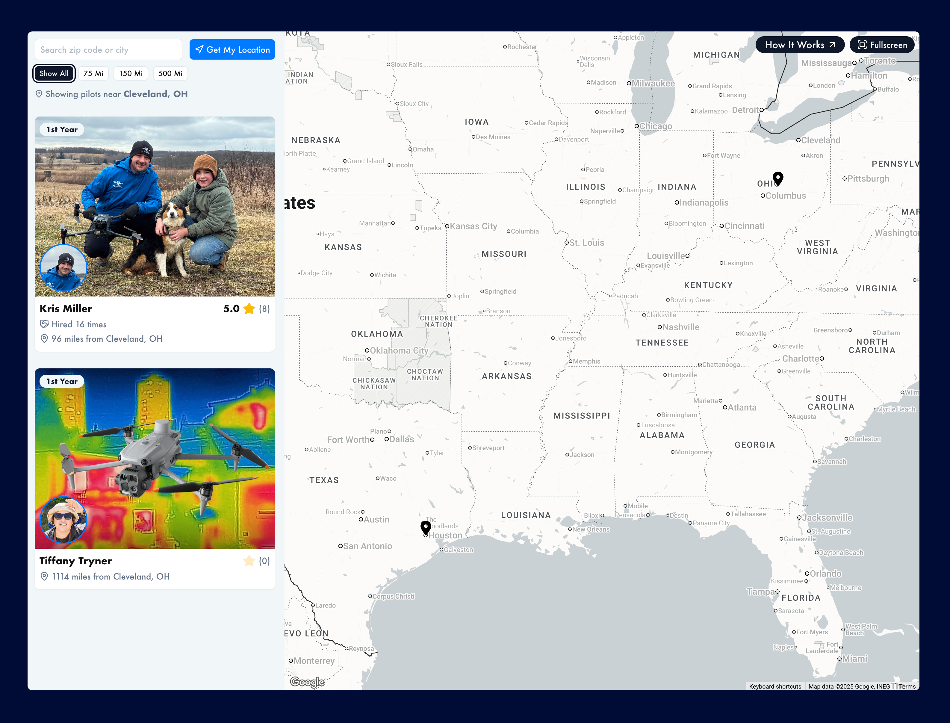 The map listing is for qualified drone pilots who hold a valid FAA Part 107 commercial license and are equipped with a Matrice 30T, Matrice 350, or Matrice 4T/4TD thermal drone. We’re looking for professionals committed to ethical, effective pet recovery. Please read over our Drone Pet Recovery Guarantee for expectations of acceptable service standards.